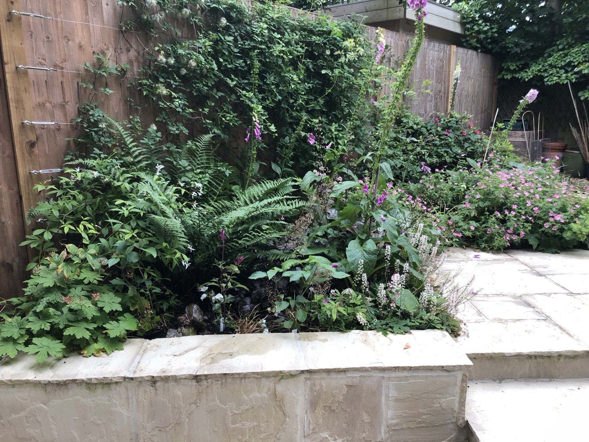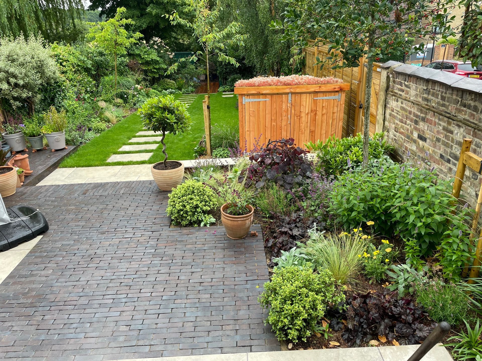 Sloping steeply away steeply from the house this garden is on several levels. A new smaller hardwood deck with wider steps to the main seating area below was built to provide more inviting access to the garden as well as a place for the BBQ and small bar area. This was softened by new planting beds providing both screening and year round interest. Further down the garden there is a new shady seating area with a swing seat, a separate storage area for bikes and the garden shed. Gates at both ends of the garden provide convenient access. Built by Greenspaces London