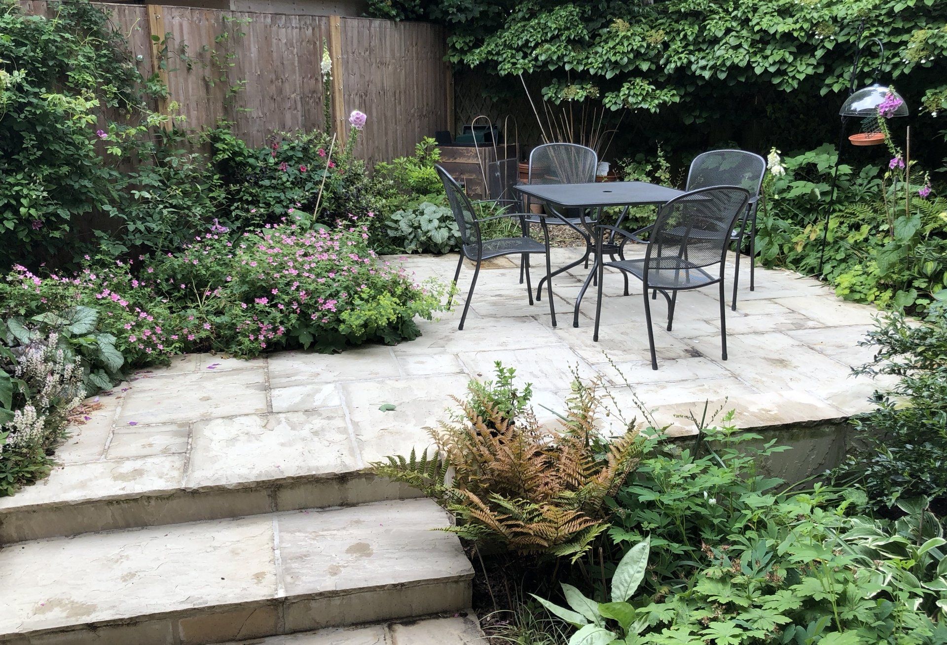 The clients were very fed up with looking out on a mostly paved garden with many different levels and tiered hard landscaping. They were keen to both maintain their unique view over the adjacent canal and to keep some privacy. We created a contemporary design using Corten Steel screening for the two seating areas and slate paving complimenting the architecture and period of the house. A
